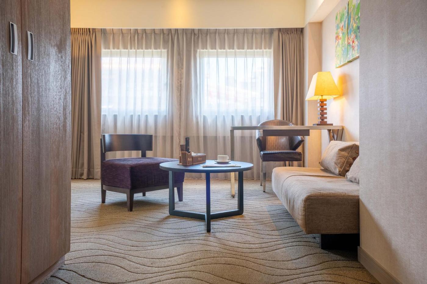 Executive Twin Room. The twin room offers a sofa, a carpeted floor, as well as a private bathroom featuring a shower and a hairdryer. The air-conditioned twin room provides a flat-screen TV with cable channels, soundproof walls, a tea and coffee maker, a wardrobe as well as city views. The unit offers 2 beds. ;
